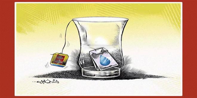 La caricatura en que Khalil participa en el Concurso representa una gota de agua en una forma de sobrecito de té, en un mensaje de muchos significados sobre el actual estado al que llegó la Tierra a consecuencia de la desertificación y la sequía.