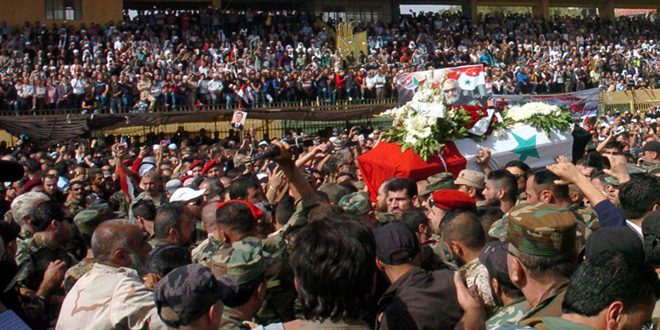 Con una participación popular y oficial, se ha celebrado hoy en su provincia natal Sweida el funeral del General de División de honor, Essam Zahreddin, que cayó mártir cunado cumplía su deber en la defensa de la patria en la provincia de Deir Ezzor.
