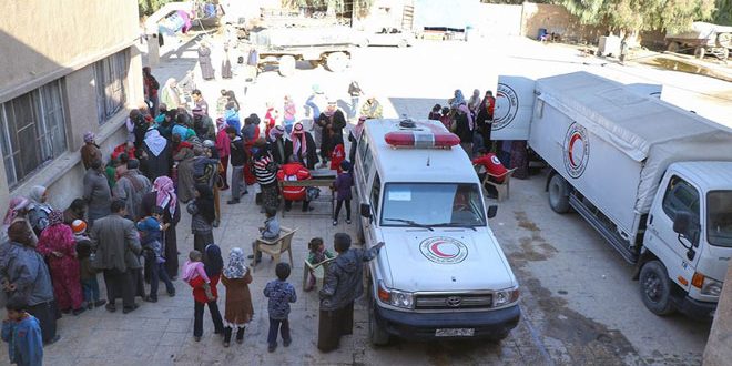 La sucursal de la Media Luna Roja siria en Deir Ezzor ofreció servicios sanitarios y medicamentos a decenas de familias de al Mayadin, recuperada por el Ejército sirio recientemente.