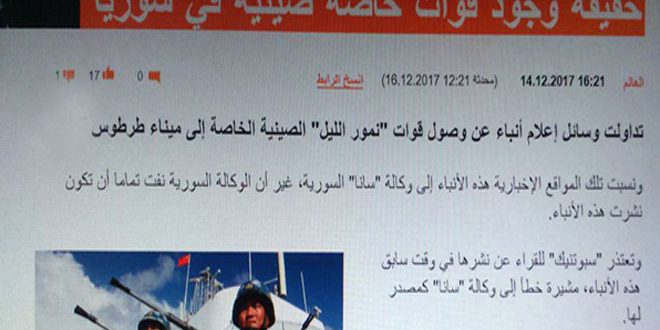 La Agencia Árabe Siria de Noticias “SANA” afirma que no publicó ninguna noticia relacionada con la llegada de fuerzas chinas a Siria, y lo que publicó la agencia Sputnik en referencia a SANA es infundado.