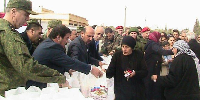 En colaboración con la gobernación de Deraa, se distribuyó ayuda humanitaria ofrecida por Rusia a los familiares de mártires y heridos del Ejército sirio, así como a los más necesitados en la localidad de Basir en el campo de Deraa.