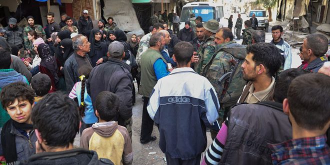Unidades del ejército árabe sirio siguen asegurando a los ciudadanos de Ghouta en sus hogares y entregar las ayudas con la cooperación de la Media Luna Roja Árabe Siria en la ciudad de Saqba después de liberarla del terrorismo.