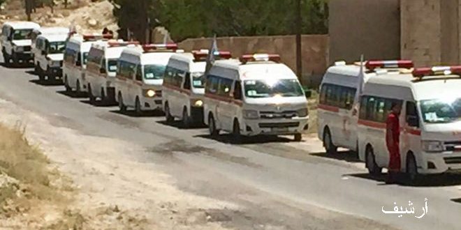 Los vehículos y autobuses de la Organización de la Media Luna Roja Árabe Siria (MLRAS) han entrado a la ciudad de Harasta en la zona de Ghouta Oriental para evacuar a cientos de armados y sus familias.