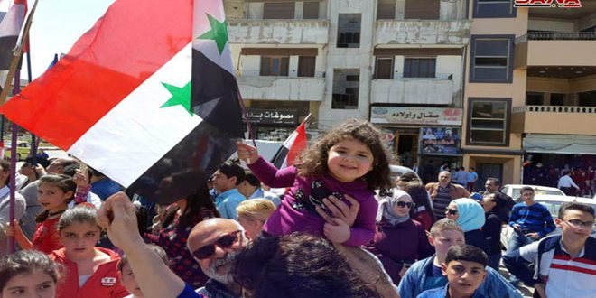 Los participantes en la concentración izaron las banderas nacionales y las pancartas de repudio a esa acción cobarde afirmando que esta tenía el objetivo de levantar la moral de las organizaciones armadas que salieron de Ghuta Oriental derrotadas.