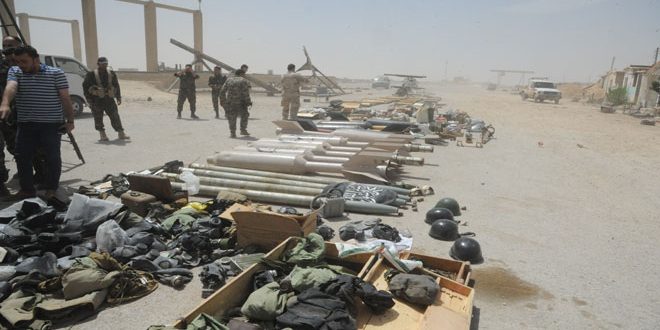 Rif Dimashq, SANA– Tropas del Ejército sirio descubrieron hoy grandes cantidades de armas y municiones que los terroristas de la organización terroristas de Yeish Al Islam habían escondido en un almacén en el área de Al Mahatta, en la localidad de Al Dumayr, al noreste de Damasco.