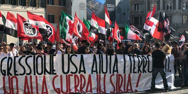 Dos manifestaciones en condena a la triple agresión contra Siria se organizaron en Roma y Nápoles, con la participación de representantes de la comunidad siria en Italia y el Frente Europeo para Defender a Siria, y varias figuras italianas que representan medios de comunicación y partidos políticos.