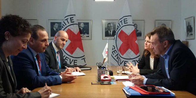Ginebra, SANA– El Ministro de Salud, Dr. Nizar Yazic, discutió con el Presidente del Comité Internacional de la Cruz Roja (CICR) en Ginebra, Peter Maurer, formas de impulsar la cooperación conjunta en el campo de la rehabilitación de las instituciones de salud afectada por el terrorismo y mediante el suministro de equipos médicos para servir a los ciudadanos.