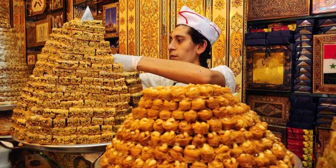 A pesar de sus precios poco económico, los sirios proceden a regalar dulces árabes rellenos de pistacho y nueces en los tiempos de las fiestas como expresión de su hospitalidad.