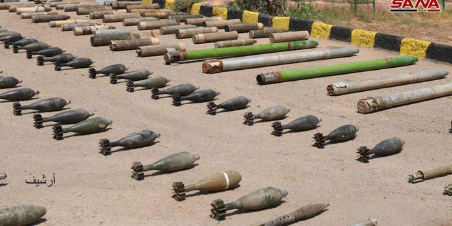 El reportero de SANA en Deir-al-Zour anunció que las autoridades competentes encontraron durante un peinado en el campo de Al-Mayadin una gran cantidad de armas y municiones y depósitos de medicamentos remanentes de los terroristas del Daesh