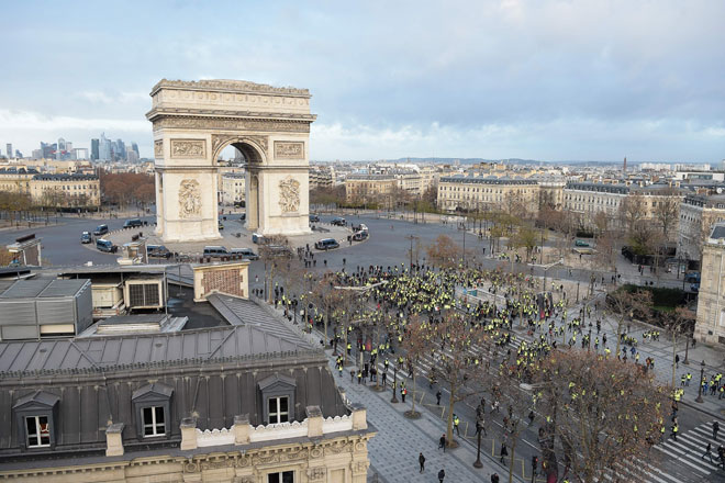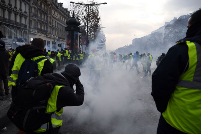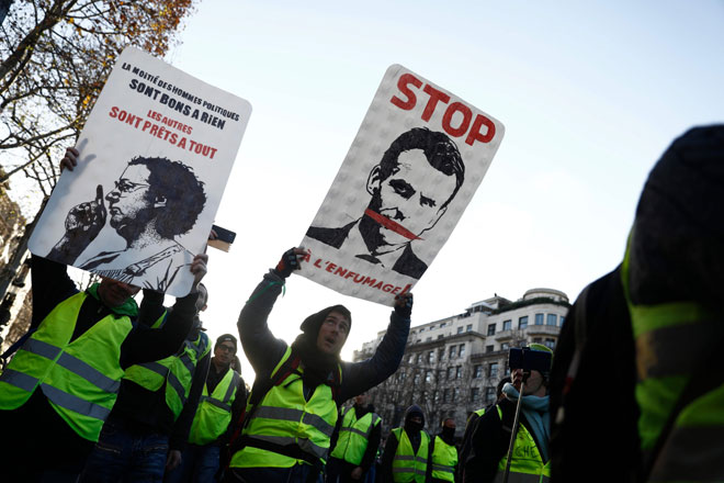 Los participantes en las manifestaciones de protesta que salieron en medio de la capital francesa por invitación de las “Camisas Amarillas” exigieron la dimisión del presidente francés Emmanuel Macron y la salida de Francia de la Unión Europea.