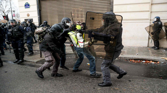 La policía francesa atacó a los manifestantes en París con porras, gas lacrimógeno y agua a presión, así como desplegó vehículos blindados en un intento de frenar las protestas desatadas en respuesta a las políticas económicas de Macron que como dicen favorecen a los ricos.