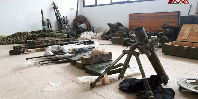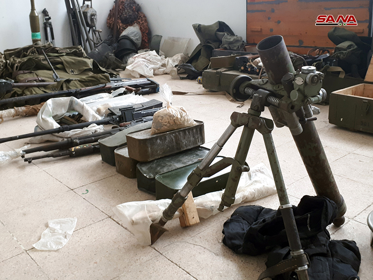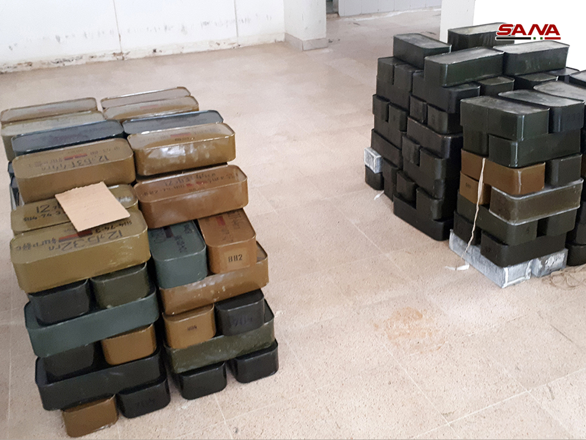 Los zapadores del ejército sirio hallaron un depósito de armas y municiones abandonado por los grupos terroristas en las tierras agrícolas al oeste de la ciudad de Nawa, en el campo de la provincia sureña siria de Deraa.
