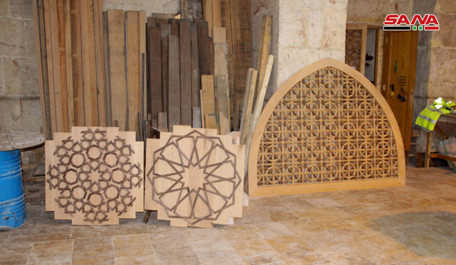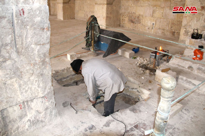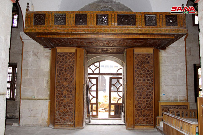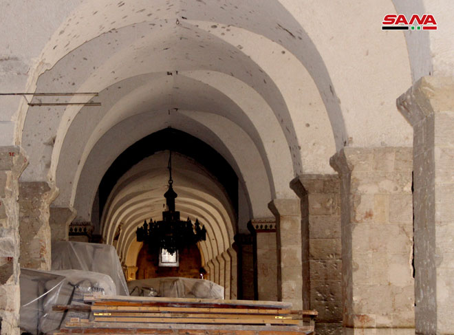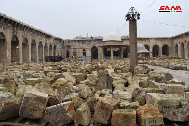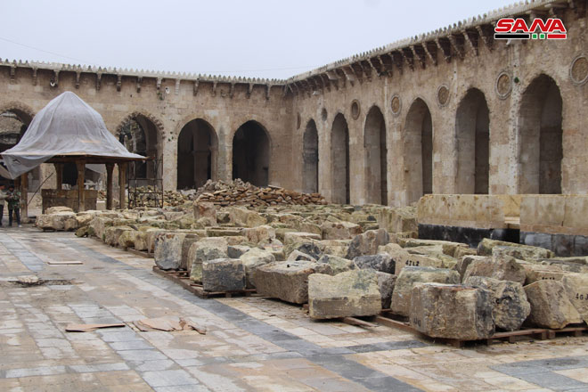 La cámara de SANA hizo un recorrido por la mezquita para estar al tanto de las obras de reparación y restauración, y se entrevistó con el Dr. Sakher Olabi, profesor de la Facultad de Arquitectura en la Universidad de Alepo y director del proyecto del proyecto restaurador quien dijo: “desde la liberación de Alepo entraron los talleres especializados y la situación estable deplorable debido a la devastación, no obstante se comenzó a trabajar y elaborar un plan para las labores de reparación.”