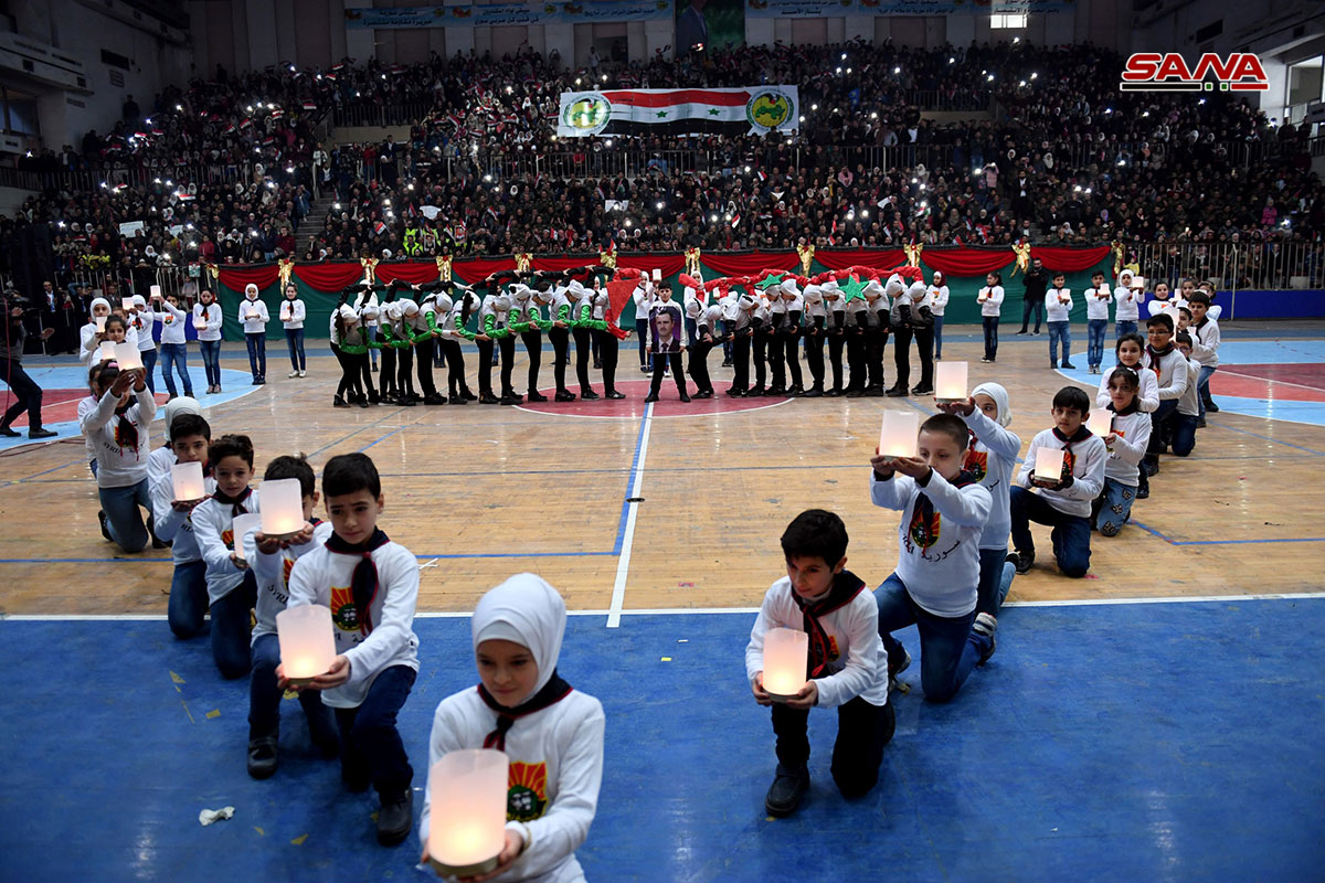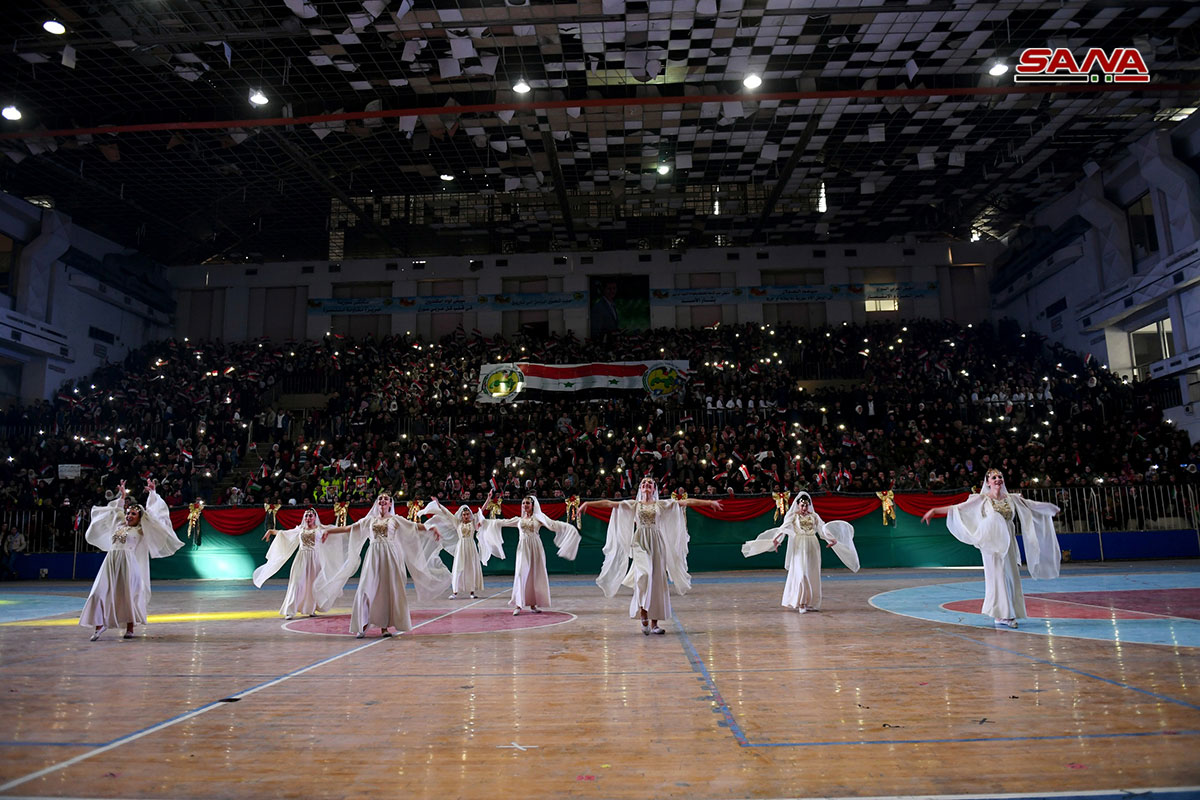 El acto festivo se celebró en la sala deportiva Al-Assad en la ciudad de Alepo, y contó con la participación de altos funcionarios del Gobierno, actores populares y sociales, y multitudes de ciudadanos.