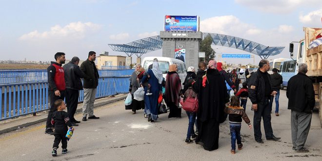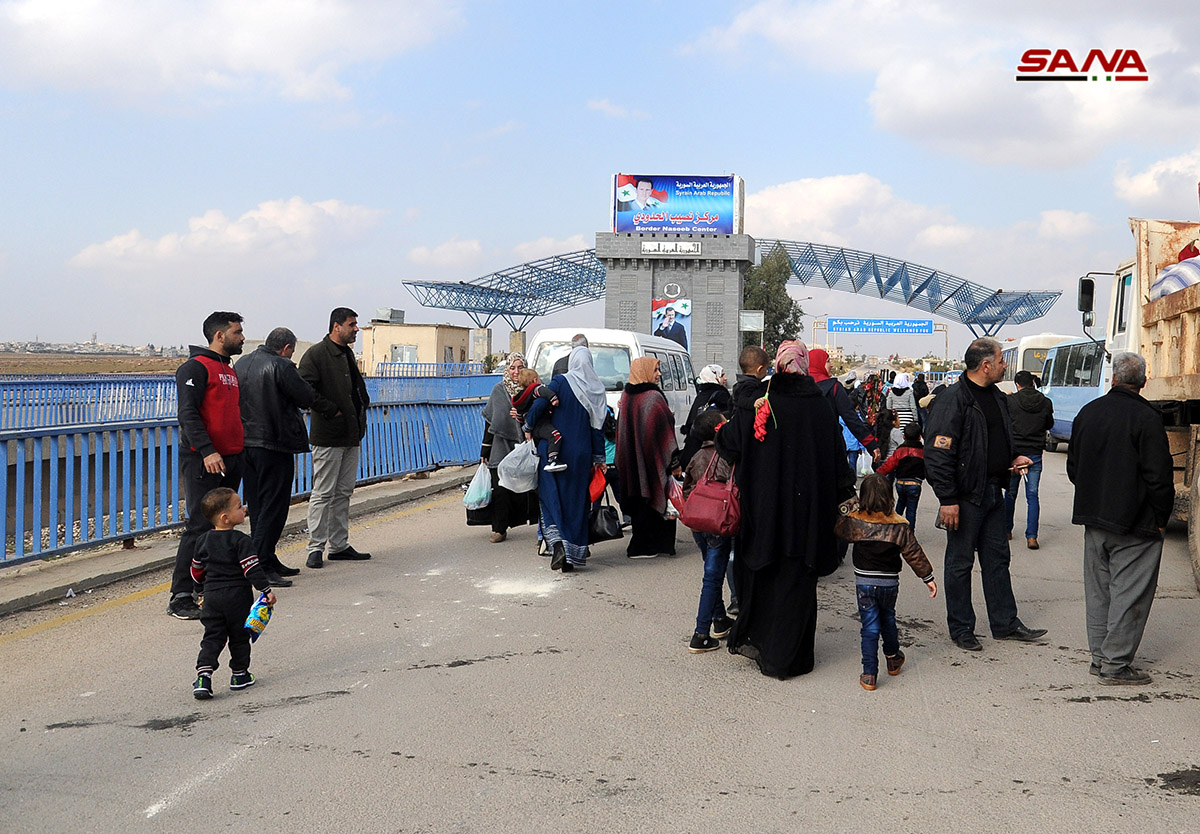 Decenas de desplazados sirios que se encontraban en los campamentos de refugiados en el territorio jordano cruzaron este miércoles el paso fronterizo de Nasib-Jaber para retornar a sus localidades y pueblos que fueron liberados del terrorismo por los héroes del Ejército sirio, informó esta tarde el reportero de SANA.