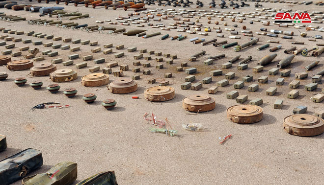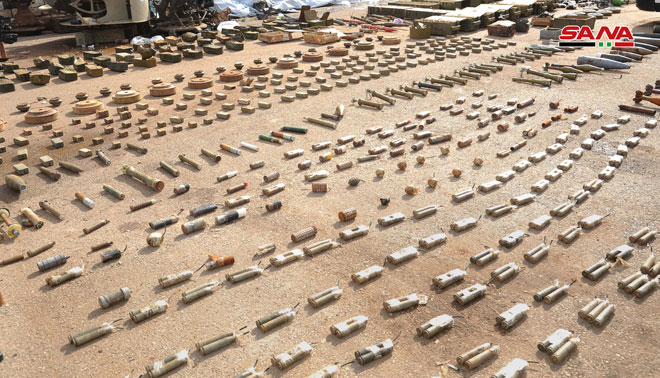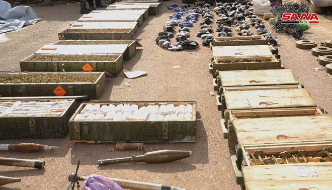 Sobre las armas incautadas, un oficial del ejército declaró que “durante las operaciones de peinado y desminado en las zonas liberadas del terrorismo, los zapadores del ejército encontraron un depósito de armas y municiones en las tierras agrícolas entre las localidades de Um Mayazen y Saida en el este de Deraa”.
