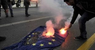 Roma, SANA Un grupo de ciudadanos italianos quemaron banderas de la Unión Europea (UE) en rechazo a la respuesta negligente de la (UE) ante la crisis por el nuevo coronavirus, …
