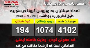 دمشق-سانا وزارت بهداشت طی بیانیه آمار کلی کرونا در سوریه را به این ترتیب اعلام کرد: موارد ابتلا 4102 موارد شفا 1074 مرگ 194