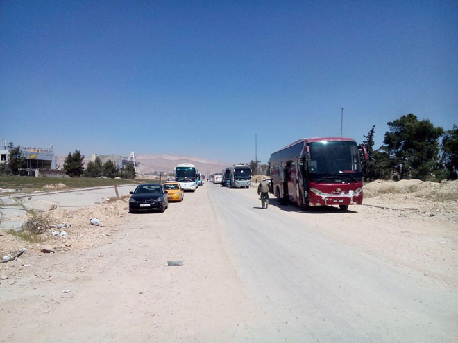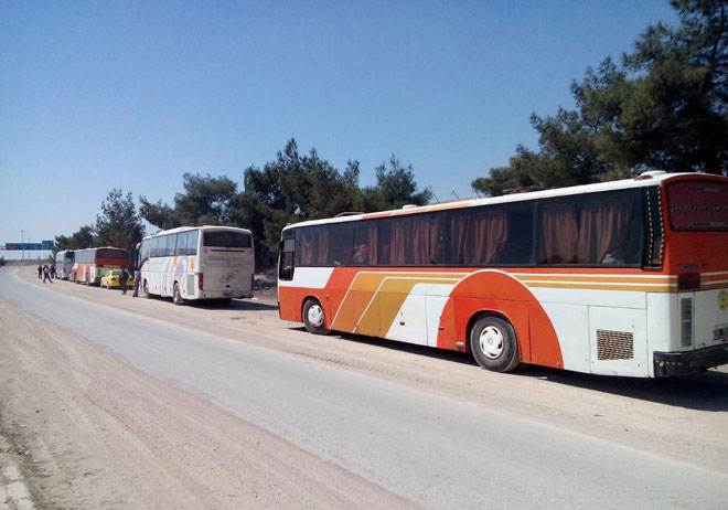 خبرنگار سانا از خروج 100دستگاه اتوبوس حامل 6749 نفر شامل 1620 تروریست از جوبر وزملكا وعربين وعين ترما در غوطه شرقی تحت نظارت جمعیت هلال احمر سو ریه خبرداد.