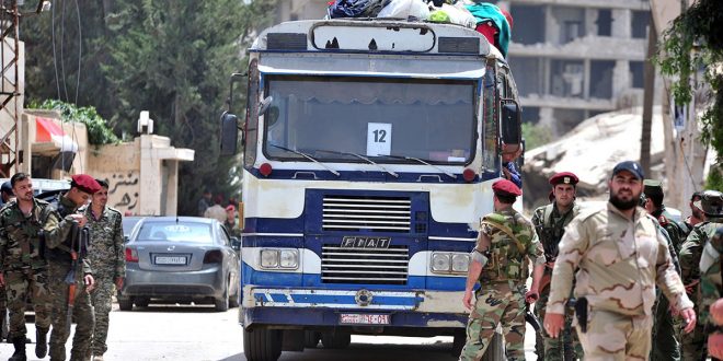 طی روز گذشته 46 اتوبوس حامل تروریست ها همراه با خانواده هایشان از شهرک های یلدا وببیلا وبیت سحم به هدف انتقال آن ها به شمال سوریه در چارچوب عملی کردن توافق مبنی بر خارج کردن کسانی که با توافق مخالفند ورسیدگی به اوضاع مایلان به ماندن پس از تسلیم اسلحه شان خارج شده بود.
