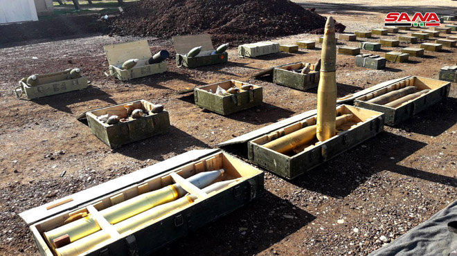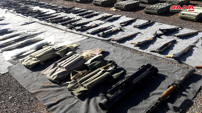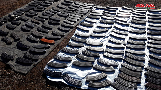 مقامات مسئول طی ادامه انجام عملیات تامین مناطق آزادشده از لوث تروریسم، مقادیر زیادی تسلیحات و مهمات که بعضی از آن ساخت انگلیس است، و خودروهای مربوط به گروهک موسوم به “گلاه سفیدها” به جا مانده از تروریست ها را در حومه های دمشق و قنیطره کشف کردند.