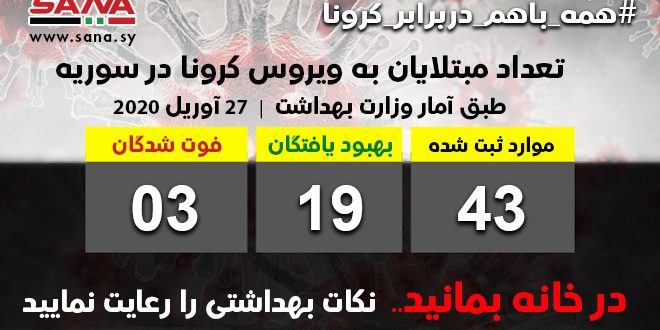 شایان به ذکر است که اولین مورد ابتلا به ویروس کرونا در سوریه در 22 ماه گذشته میلادی برای یک نفر بازگشته از خارج ثبت شده بود.