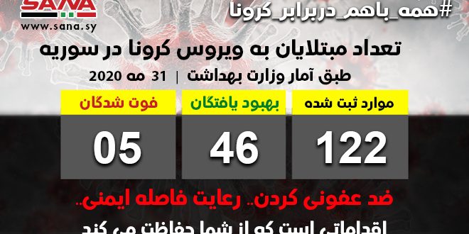 وزارت اشاره کرد که آمار کلی مبتلایان به ویروس کرونا در سوریه تا امروز به 122 نفر رسیده است که 46 نفر از آنها شفا یافتند و5 نفر فوت کردند.