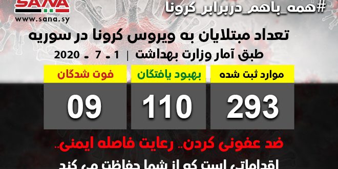 وزارت با صدور بیانیه ای توضیح داد : آمار کلی مبتلایان به ویروس کرونا در سوریه تا این لحظه /293/ نفر شد که از این موارد /110/ مورد شفا یافتند و/9/ نفر فوت کردند.
