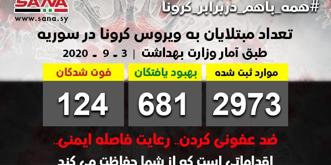 03/09/2020 مقالات مشابهة دادستان کل دمشق از تعدادی از کلانتریها بازدید و بر لزوم تضمین حقوق بازداشتشدگان و پایبندی به رویههای قانونی تأکید کرد 04/06/2025 وزیر اطلاع رسانی با هیئتی از سازمان سوئیسی «هیروندل» در مورد راههای همکاری در مرحله عدالت انتقالی گفتگو میکند 04/06/2025 دیدار رئیس جمهور الشرع و وزیر الشیبانی با دوبراوکا شیکا کمیسر اتحادیه اروپا 04/06/2025 دمشق-سانا وزارت بهداشت از ثبت /75/ مورد جدید ابتلا به ویروس کرونا وبهبودی /20/ مبتلا و فوت /4/ تن بر اثر ابتلا به این بیماری در سوریه خبر داد. وزارت بهداشت توضیح داد: با ثبت موارد جدید، آمار کل مبتلایان تا امروز به /2973/ نفر رسیده است . وزارت بهداشت نیز بهبودی /681/ مبتلا و فوت /124/ تن بر اثر ابتلا به این بیماری اعلام کرد. شایان به ذکر است که اولین مورد ابتلا به ویروس کرونا در سوریه در 22 ماه مارس گذشته میلادی برای یک نفر بازگشته از خارج ثبت شده بود. 2020-09-03 sana شاركها