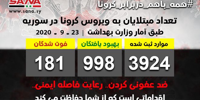 وزارت بهداشت با صدور یک بیانیه اعلام کرد:پس از شناسایی /47/ مورد ابتلای جدید وشفای15نفر وفوت 3نفر آمار کلی مبتلایان به کرونا در سوریه تا این لحظه /3924/ مورد است که /998/ از آنها بهبود یافتند و /181/ فوت شدند