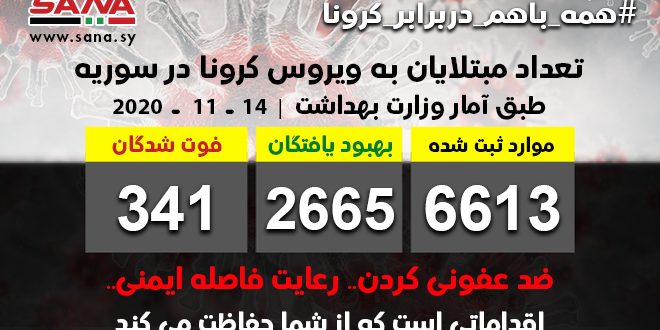 14/11/2020 مقالات مشابهة دادستان کل دمشق از تعدادی از کلانتریها بازدید و بر لزوم تضمین حقوق بازداشتشدگان و پایبندی به رویههای قانونی تأکید کرد 04/06/2025 وزیر اطلاع رسانی با هیئتی از سازمان سوئیسی «هیروندل» در مورد راههای همکاری در مرحله عدالت انتقالی گفتگو میکند 04/06/2025 دیدار رئیس جمهور الشرع و وزیر الشیبانی با دوبراوکا شیکا کمیسر اتحادیه اروپا 04/06/2025 دمشق-سانا امروز وزارت بهداشت از شناسایی 61 مورد ابتلا به ویروس کرونا وشفای 56 نفر وفوت 4 نفر از مجموع مبتلایان به این ویروس در کشور خبر داد. وزارت با صدور بیانیه ای گفت: آمار کلی موارد ابتلا ثبت شده در سوریه تا امروز 6613 نفر است که 2665 از آن بهبود یافتند و 341 نفر فوت شدند. شایان به ذکر است که اولین مورد ابتلا به ویروس کرونا در سوریه در 22 ماه مارس گذشته میلادی برای یک نفر بازگشته از خارج ثبت شده بود. 2020-11-14 sana شاركها