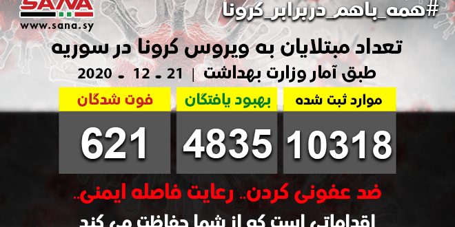 21/12/2020 مقالات مشابهة دادستان کل دمشق از تعدادی از کلانتریها بازدید و بر لزوم تضمین حقوق بازداشتشدگان و پایبندی به رویههای قانونی تأکید کرد 04/06/2025 وزیر اطلاع رسانی با هیئتی از سازمان سوئیسی «هیروندل» در مورد راههای همکاری در مرحله عدالت انتقالی گفتگو میکند 04/06/2025 دیدار رئیس جمهور الشرع و وزیر الشیبانی با دوبراوکا شیکا کمیسر اتحادیه اروپا 04/06/2025 دمشق-سانا امروز وزارت بهداشت از شناسایی 123 مورد ابتلا به ویروس کرونا وشفای 49 نفر وفوت 11 نفر از مجموع مبتلایان به این ویروس در کشور خبر داد. وزارت با صدور بیانیه ای گفت: آمار کلی موارد ابتلا ثبت شده در سوریه تا امروز 10318 نفر است که 4835 از آن بهبود یافتند و 621 نفر فوت شدند. شایان به ذکر است که اولین مورد ابتلا به ویروس کرونا در سوریه در 22 ماه مارس گذشته میلادی برای یک نفر بازگشته از خارج ثبت شده بود. 2020-12-21 sana شاركها