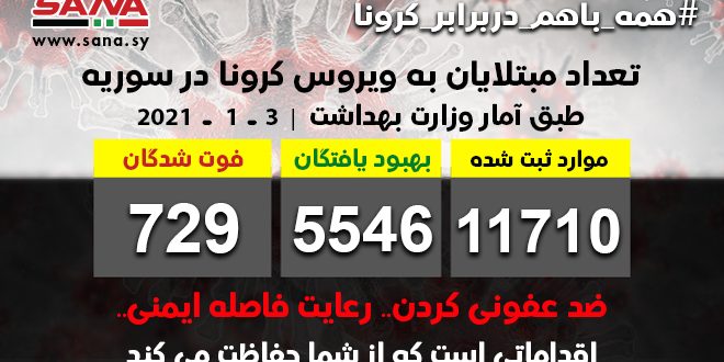 03/01/2021 مقالات مشابهة دادستان کل دمشق از تعدادی از کلانتریها بازدید و بر لزوم تضمین حقوق بازداشتشدگان و پایبندی به رویههای قانونی تأکید کرد 04/06/2025 وزیر اطلاع رسانی با هیئتی از سازمان سوئیسی «هیروندل» در مورد راههای همکاری در مرحله عدالت انتقالی گفتگو میکند 04/06/2025 دیدار رئیس جمهور الشرع و وزیر الشیبانی با دوبراوکا شیکا کمیسر اتحادیه اروپا 04/06/2025 دمشق-سانا امروز وزارت بهداشت از شناسایی 94 مورد ابتلا به ویروس کرونا وشفای 61 نفر وفوت 6 نفر از مجموع مبتلایان به این ویروس در کشور خبر داد. وزارت با صدور بیانیه ای گفت: آمار کلی موارد ابتلا ثبت شده در سوریه تا امروز 11710 نفر است که 5546 از آن بهبود یافتند و 729 نفر فوت شدند. شایان به ذکر است که اولین مورد ابتلا به ویروس کرونا در سوریه در 22 ماه مارس گذشته میلادی برای یک نفر بازگشته از خارج ثبت شده بود. 2021-01-03 sana شاركها