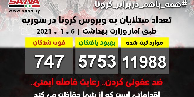 06/01/2021 مقالات مشابهة دادستان کل دمشق از تعدادی از کلانتریها بازدید و بر لزوم تضمین حقوق بازداشتشدگان و پایبندی به رویههای قانونی تأکید کرد 04/06/2025 وزیر اطلاع رسانی با هیئتی از سازمان سوئیسی «هیروندل» در مورد راههای همکاری در مرحله عدالت انتقالی گفتگو میکند 04/06/2025 دیدار رئیس جمهور الشرع و وزیر الشیبانی با دوبراوکا شیکا کمیسر اتحادیه اروپا 04/06/2025 دمشق-سانا امروز وزارت بهداشت از شناسایی 98 مورد ابتلا به ویروس کرونا وشفای 67 نفر وفوت 6 نفر از مجموع مبتلایان به این ویروس در کشور خبر داد. وزارت با صدور بیانیه ای گفت: آمار کلی موارد ابتلا ثبت شده در سوریه تا امروز 11988 نفر است که 5753 از آن بهبود یافتند و 747 نفر فوت شدند. شایان به ذکر است که اولین مورد ابتلا به ویروس کرونا در سوریه در 22 ماه مارس گذشته میلادی برای یک نفر بازگشته از خارج ثبت شده بود. 2021-01-06 sana شاركها