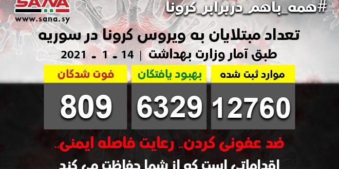 15/01/2021 مقالات مشابهة دادستان کل دمشق از تعدادی از کلانتریها بازدید و بر لزوم تضمین حقوق بازداشتشدگان و پایبندی به رویههای قانونی تأکید کرد 04/06/2025 وزیر اطلاع رسانی با هیئتی از سازمان سوئیسی «هیروندل» در مورد راههای همکاری در مرحله عدالت انتقالی گفتگو میکند 04/06/2025 دیدار رئیس جمهور الشرع و وزیر الشیبانی با دوبراوکا شیکا کمیسر اتحادیه اروپا 04/06/2025 دمشق-سانا امروز وزارت بهداشت از شناسایی 100 مورد ابتلا به ویروس کرونا وشفای 70 نفر وفوت 10 نفر از مجموع مبتلایان به این ویروس در کشور خبر داد. وزارت با صدور بیانیه ای گفت: آمار کلی موارد ابتلا ثبت شده در سوریه تا امروز 12760 نفر است که 6329 از آن بهبود یافتند و 809 نفر فوت شدند. شایان به ذکر است که اولین مورد ابتلا به ویروس کرونا در سوریه در 22 ماه مارس گذشته میلادی برای یک نفر بازگشته از خارج ثبت شده بود. 2021-01-15 sana شاركها