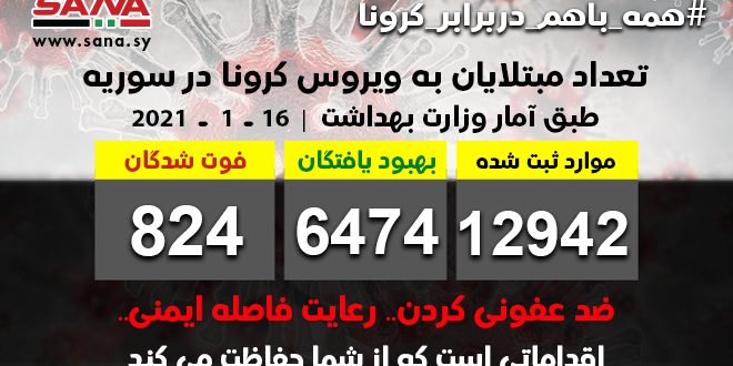 16/01/2021 مقالات مشابهة دادستان کل دمشق از تعدادی از کلانتریها بازدید و بر لزوم تضمین حقوق بازداشتشدگان و پایبندی به رویههای قانونی تأکید کرد 04/06/2025 وزیر اطلاع رسانی با هیئتی از سازمان سوئیسی «هیروندل» در مورد راههای همکاری در مرحله عدالت انتقالی گفتگو میکند 04/06/2025 دیدار رئیس جمهور الشرع و وزیر الشیبانی با دوبراوکا شیکا کمیسر اتحادیه اروپا 04/06/2025 دمشق-سانا امروز وزارت بهداشت از شناسایی 92 مورد ابتلا به ویروس کرونا وشفای 69 نفر وفوت 7 نفر از مجموع مبتلایان به این ویروس در کشور خبر داد. وزارت با صدور بیانیه ای گفت: آمار کلی موارد ابتلا ثبت شده در سوریه تا امروز 12942 نفر است که 6474 از آن بهبود یافتند و 824 نفر فوت شدند. شایان به ذکر است که اولین مورد ابتلا به ویروس کرونا در سوریه در 22 ماه مارس گذشته میلادی برای یک نفر بازگشته از خارج ثبت شده بود. 2021-01-16 sana شاركها