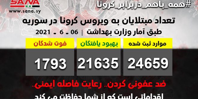 وزارت با صدور بیانیه ای گفت: آمار کلی موارد ابتلا ثبت شده در سوریه تا امروز /24659/ نفر است که /21635/ از آن بهبود یافتند و /1793/ نفر فوت شدند.
