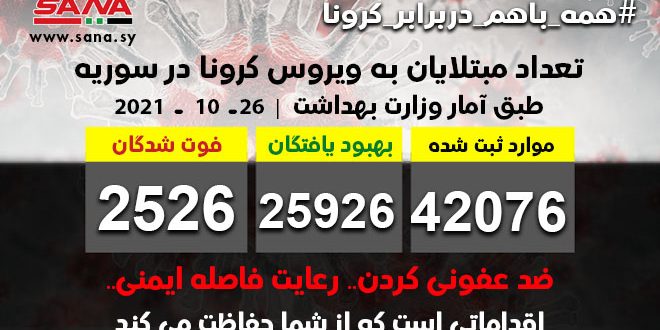 وزارت بهداشت با صدور بیانیهای اعلام کرد: مجموع مبتلایان به کرونا در کشور به 42076 نفر رسیده است که از این تعداد، 25926 نفر بهبود پیدا کرده اند. تعداد فوتیهای ناشی از ابتلا به ویروس کرونا در سوریه نیز در مجموع به 2526 نفر رسیده است.