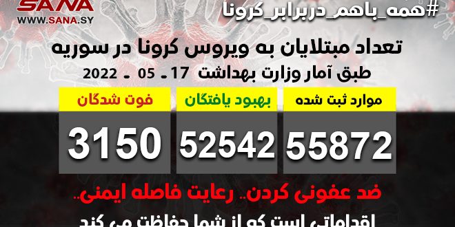 وزارت بهداشت سوریه با صدور بیانیهای اعلام کرد مجموع مبتلایان به کرونا به 55872 نفر رسیده است که از این تعداد، 52542 نفر بهبود پیدا کرده اند. تعداد فوتیهای ناشی از ابتلا به ویروس کرونا در سوریه نیز در مجموع به 3150 نفر رسیده است.