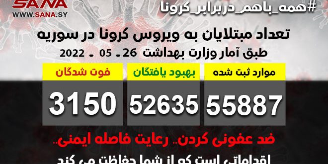 وزارت بهداشت سوریه با صدور بیانیهای اعلام کرد مجموع مبتلایان به کرونا به 55887 نفر رسیده است که از این تعداد، 52635 نفر بهبود پیدا کرده اند. تعداد فوتیهای ناشی از ابتلا به ویروس کرونا در سوریه نیز در مجموع به 3150 نفر رسیده است.