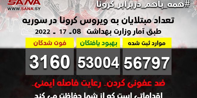 وزارت بهداشت سوریه با صدور بیانیهای اعلام کرد مجموع مبتلایان به کرونا به 56797نفر رسیده است که از این تعداد، 53004 نفر بهبود پیدا کرده اند. تعداد فوتیهای ناشی از ابتلا به ویروس کرونا در سوریه نیز در مجموع به 3160 نفر رسیده است.