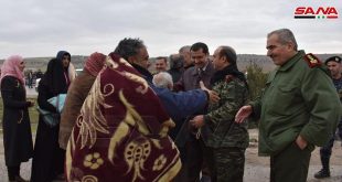 Idleb-SANA / Lors du ratissage de la ville de Maarret Nu’man pour la déminer, les unités de l’armée arabe syrienne ont sécurité un certain nombre de familles qui étaient restées …