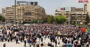 Alep/ La place de Saad Jaberi à Alep a connu aujourd’hui un rassemblement populaire pour célébrer les victoires réalisées par l’armée arabe syrienne à la Ghouta orientale. D.H./ L.A.