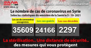 Damas -SANA/ Le ministère de la Santé a indiqué aujourd’hui que 343 nouveaux cas de coronavirus, 70 cas de guérison et 10 décès avaient été enregistrés en Syrie. Dans un …