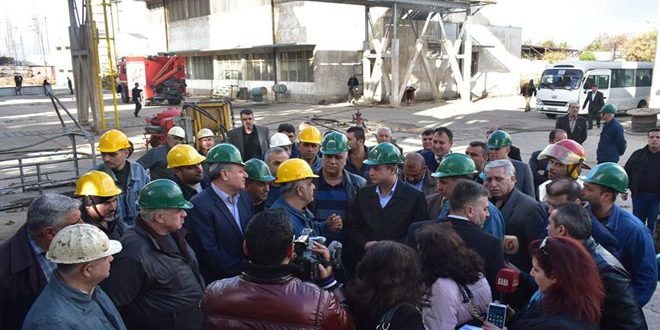Il a souligné l’importance du principe de l’autarcie adopté dans la raffinerie de Homs, en vue d’assurer les besoins du pays en dérivés stratégiques, malgré les attaques terroristes et les martyrs parmi les ouvriers, sans arrêter le travail dans la raffinerie.