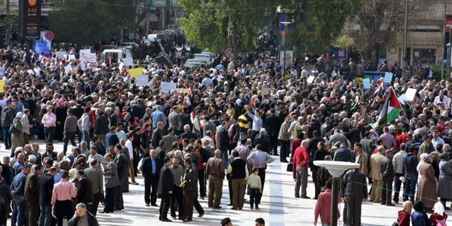 Les participants ont scandé des slogans affirmant que la Syrie restera toujours unifiée et que tout agresseur sera vaincu.