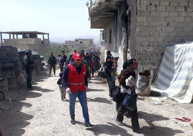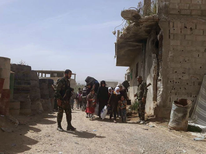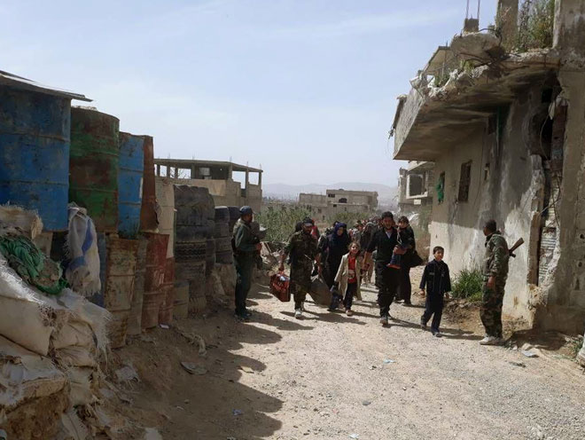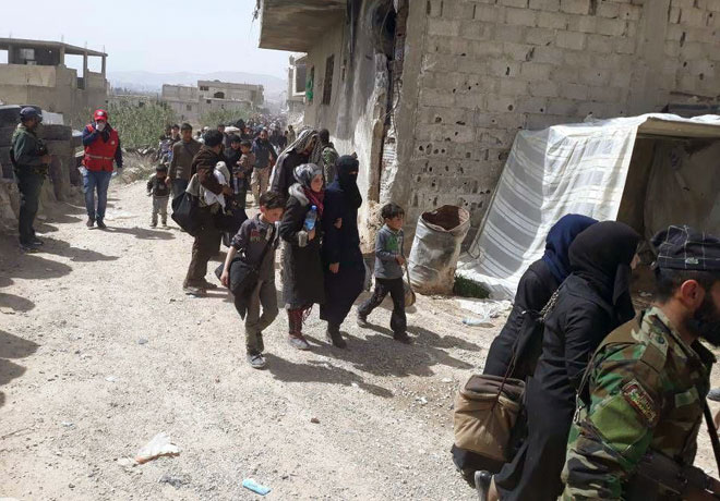 Banlieue de Damas/ Des unités de l’armée arabe syrienne ont évacué ce matin des milliers de civils, séquestrés par les terroristes dans la partie nord de la Ghouta orientale dans la banlieue de Damas, via le corridor du camp de Wafidine.