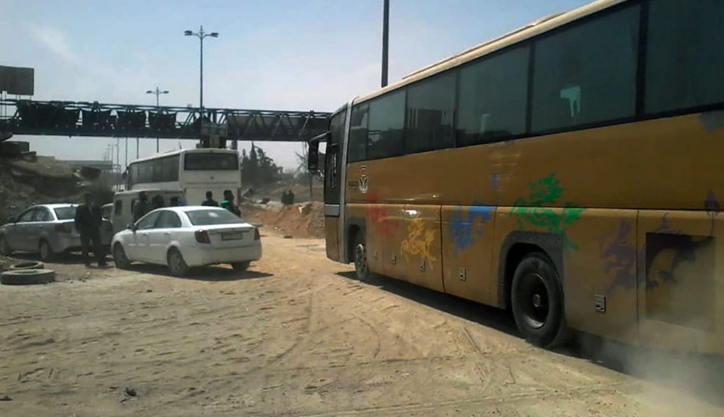 Banlieue de Damas/ La ville de Harasta à Ghouta est dans la banlieue de Damas a été proclamée ce soir comme vide du terrorisme après l’évacuation de la 2e partie des hommes armés et de leurs familles rejetant la réconciliation vers le gouvernorat d’Idleb.