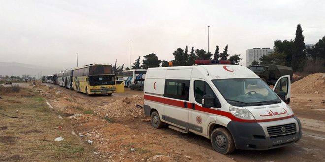 Le correspondant de Sana a dit que 69 autobus avaient été assurés pour transporter 4108 personnes, dont 1017 terroristes, de Jobar, Zamalka, Irbine et Ain Tarma à Ghouta est, au gouvernorat d’Idleb.