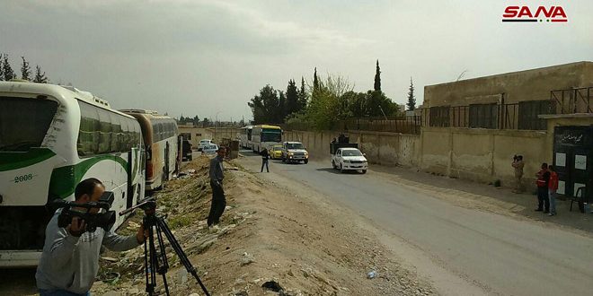 Banlieue de Damas/La 2e partie des terroristes de «l’Armée de l’Islam» et de leurs familles a quitté la ville de Douma dans la banlieue de Damas vers Jarablos et ce en prélude à vider la ville des terroristes et au retour des établissements étatiques ont commencé aujourd’hui.